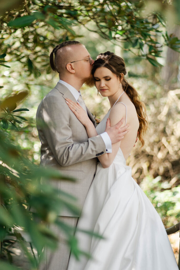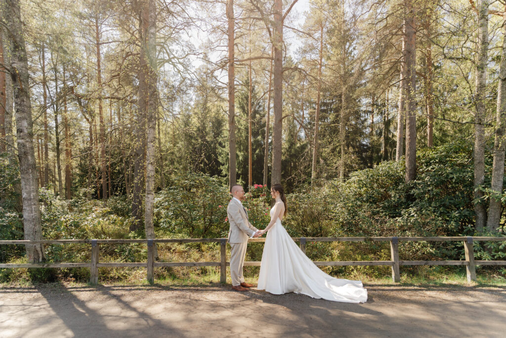 Tämä hääkuvaus Haagan Alppiruusupuistossa Helsingissä alkoi first look-hetkellä. Häät olivat toukokuun puolivälissä, ja vaikka alppiruusut eivät vielä olleet täydessä loistossaan, löysimme onneksi muutamia kauniisti kukkivia pensaita.